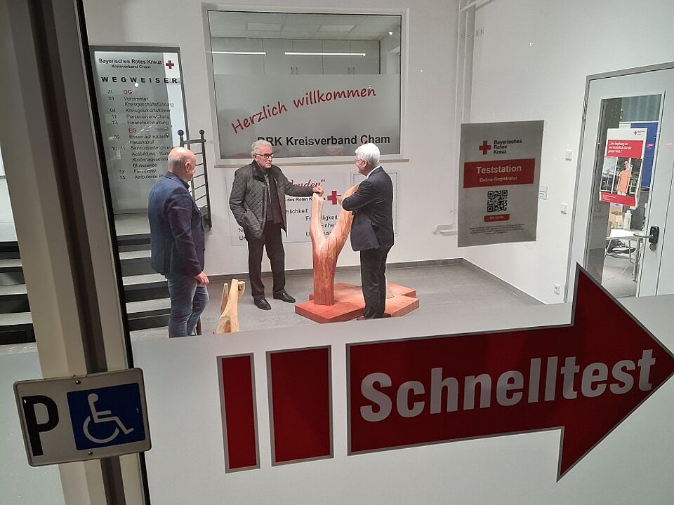 Cham. Das Foyer der BRK-Kreisgeschäftsstelle war seit der Eröffnung der neuen Räume in der Further Straße im Herbst 2020 eher karg ausgestattet. Im Lehrsaal, der durch den Vorraum betreten werden kann und für Erste-Hilfe-Kurse und andere Veranstaltungen mit öffentlichem Charakter vorgesehen wäre, herrschte bisher kein Schulungs-, sondern ausschließlich Schnelltest-Betrieb. Die Zahl der offiziellen Besucher hielt sich in Corona-Zeiten in Grenzen, der Publikumsverkehr ging gegen null.