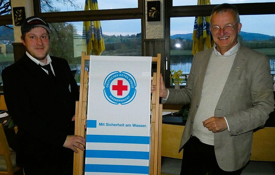 Die Vorstandschaft bedankte sich bei Markus Ackermann mit einem Wasserwacht-Liegestuhl, auf dem er im Ruhestand relaxen könne, für die Unterstützung.