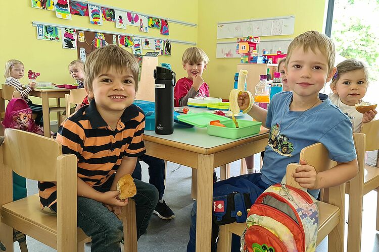 Am Tisch ist uns ein guter Umgang miteinander und mit den angebotenen Lebensmitteln wichtig. Wir unterstützen die Kinder, selbstständig zu essen und mit Besteck umzugehen. Neben einer guten Tischkultur legen wir Wert auf eine gemütliche und entspannte Atmosphäre, bei der sich alle wohlfühlen, das Miteinander genießen und sich unterhalten.